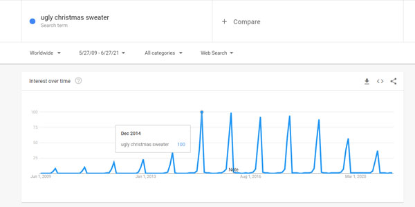 De acordo com os dados do Google nos últimos cinco anos, o volume de buscas por "Suéter feio de natal" vem aumentando ano após ano. Em dezembro de 2011, o volume de busca de "Ugly christmas sweater" era 0,