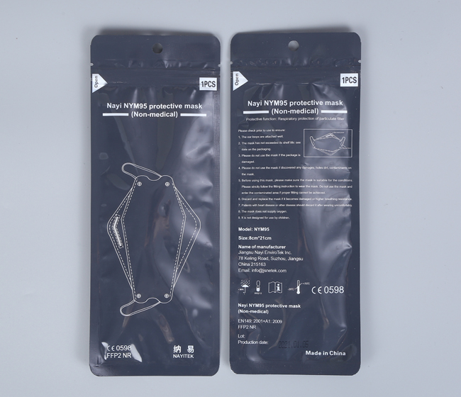 Introducción de la mascarilla facial NayiTek KN95 Estilo NO .: NYM95; Color opciones: Blanco (servicio de stock). Los colores azul / negro necesitan hechos a medida; Embalaje: 1 pieza por bolsa; Entrega: Servicio de stock (pedidos superiores a 10,000 piezas necesitan negociación); Certificado: CE 0598 FFP2 y FDA; Informe de prueba de : Informe de prueba de SGS disponible Diseño de : Tela meltblown + Tela tejida; Eficiencia de filtración> 99%; Forma larga y estrecha con mentonera y puente nasal esponjoso; Resistencia respiratoria: nivel FFP3.