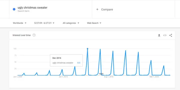Según los datos de Google en los últimos cinco años, el volumen de búsqueda de "Ugly christmas sweater" ha ido aumentando año tras año. En diciembre de 2011, el volumen de búsquedas de "suéter navideño feo" era 0 y alcanzó el máximo de 100 a mediados de diciembre de 2014.