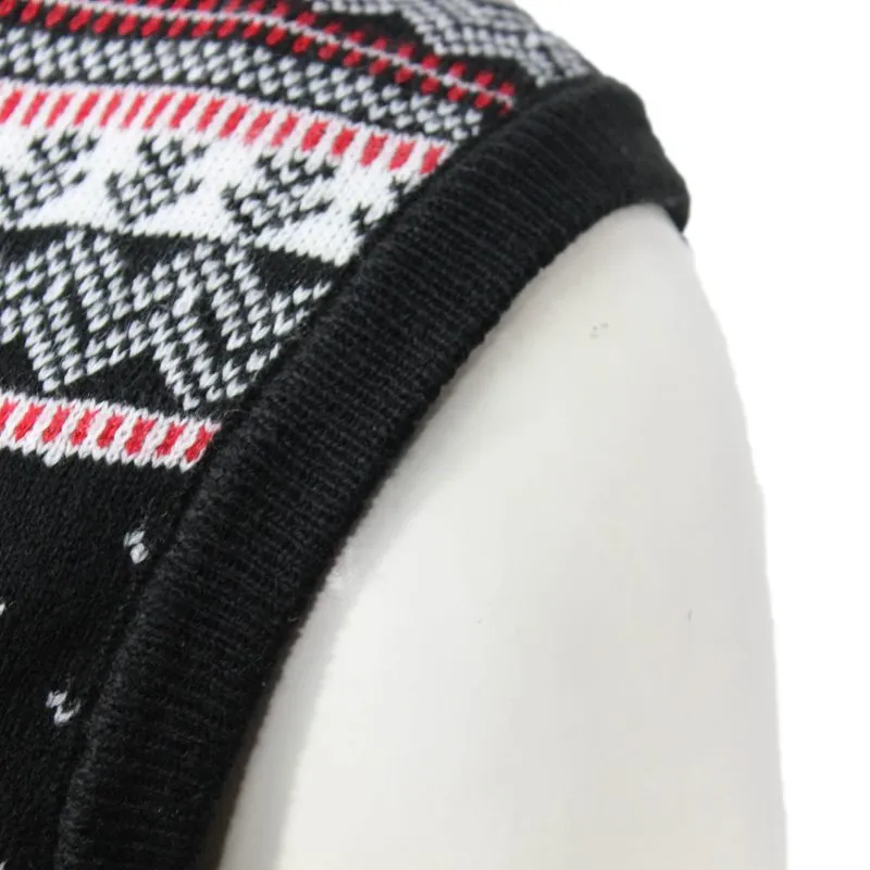 ¿Buscas un feo suéter navideño sin mangas? Aquí está. Un diseño sin mangas único como un chaleco. una hermosa casa está impresa en el frente con un fondo negro. ¿Y lo que es más? Bueno, también puedes imprimir tu propio diseño en el frente. Así que mira esto y contáctanos para obtener más información. Se acerca la temporada navideña, Christmas Jumper pronto será popular. Este diseño ha sido realizado en acrílico, rango de tamaño S-4XL, patrón, color, rangos de tamaño, todos se pueden personalizar. Es ideal para mayoristas, compradores de marcas, uso promocional. Con 35 años de experiencia en la fabricación, estamos seguros de poder suministrar un jersey navideño de gran calidad.